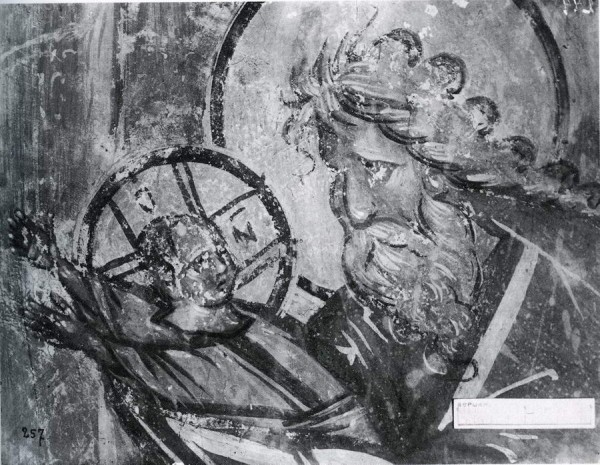 И вот там, внутри храма над аркой, с левой стороны стоят Пресвятая Богородица и Иосиф, а с правой стороны — громадный, косматый Старец Симеон. Волосы развеваются, страшное грушевидное лицо, и он держит на руках Младенца. Он держит на руках Богомладенца, и Он изображен не так, как мы стандартно думаем о сорокадневном младенце — совсем маленький, а на этой фреске он подрастающий Младенец, Которому уже больше времени прошло, Он может уже воспринимать окружающий мир, ручками реагировать. И вот там изображен Младенец, который так испугался старца Симеона, что он всей своей маленькой душой боится, от него отстраняется, ручки развел, к маме хочет. А тот его держит в руках и сам боится. И Младенец боится, и старец боится! Старец страшится — он знает, Кого он держит на руках!