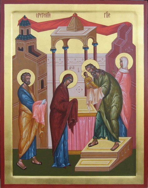 Само событие удивительное, переживается многими и многими людьми как особенное. Почему? Здесь встретились два мира — мир Ветхого Завета в лице старца Симеона, и в лице Богомладенца Христа — новая жизнь человечества, исполнение того, о чем только лишь скорбели, мечтали, молились и просили древние люди. Встреча лицом к Лицу. Богомладенец Господь Иисус Христос на руках у старца Симеона. И возникает такое светлое-светлое, умиротворённое, удивительно тихое, радостное, смиренное состояние, ощущение вот этой встречи в тишине и радости. Эта встреча изображается на иконах праздника, когда Богомладенец лежит на руках старца Симеона.