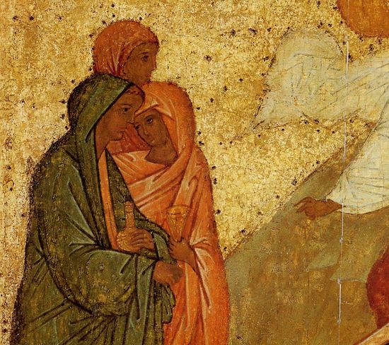 Сильная любовь этих простых и слабых женщин заставляет их бежать на гроб Живодавца. К своему изумлению они находят его пустым, а потому недоумевают, удивляются, ликуют и воодушевляются. Они купили дорогих благовоний, встали рано утром, изгнали из своих сердец беспокойный страх и пришли на гроб до восхода некоего изумительного солнца. Все для них светло, чисто, непорочно, священно, честно, прозрачно, чарующе, светоносно, благодатно и радостно. Они пришли, чтобы помазать благовониями, но вместо этого умастили благовониями их самих. Их жизнь наполнилась бесконечным светом, смыслом, жизнью, бесстрашием и сладостью.