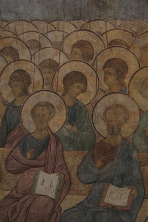 И, пожалуй, жажду единства Андрей Рублев почерпнул не у Феофана Грека. Здесь его главным учителем становится преподобный Сергий Радонежский, вдохновивший и благословивший Дмитрия Донского на Куликовскую битву и проповедовавший «идею соборности». Именно она, эта «идея соборности» давала Андрею Рублеву творческие силы. О ней тосковала душа художника, ища в страшной действительности образы для ее воплощения. И как не странно, тема Страшного Суда, до Рублева только лишь разъединявшая, стала одним из выдающихся воплощений союза и связанности людей.
