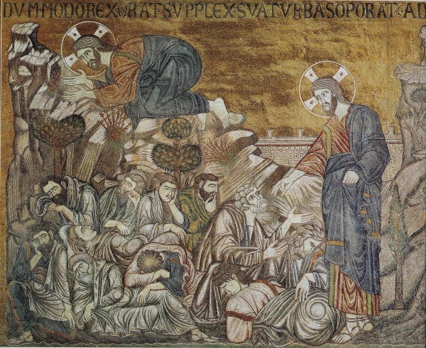 «Потом приходит с ними Иисус на место, называемое Гефсимания, и говорит ученикам: посидите тут, пока Я пойду, помолюсь там. И, взяв с Собою Петра и обоих сыновей Зеведеевых, начал скорбеть и тосковать. Тогда говорит им Иисус: душа Моя скорбит смертельно; побудьте здесь и бодрствуйте со Мною. И, отойдя немного, пал на лице Свое, молился и говорил: Отче Мой! если возможно, да минует Меня чаша сия; впрочем не как Я хочу, но как Ты. И приходит к ученикам и находит их спящими, и говорит Петру: тáк ли не могли вы один час бодрствовать со Мною? бодрствуйте и молитесь, чтобы не впасть в искушение: дух бодр, плоть же немощна. Еще, отойдя в другой раз, молился, говоря: Отче Мой! если не может чаша сия миновать Меня, чтобы Мне не пить ее, да будет воля Твоя». (Мф. 26: 36-42)