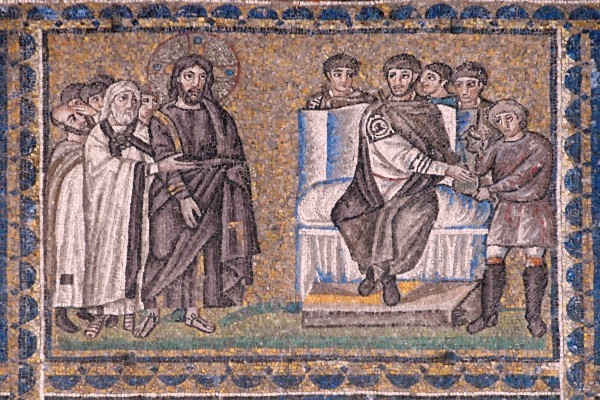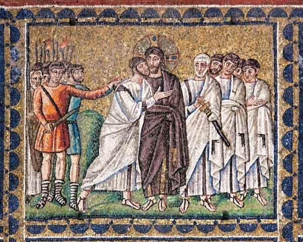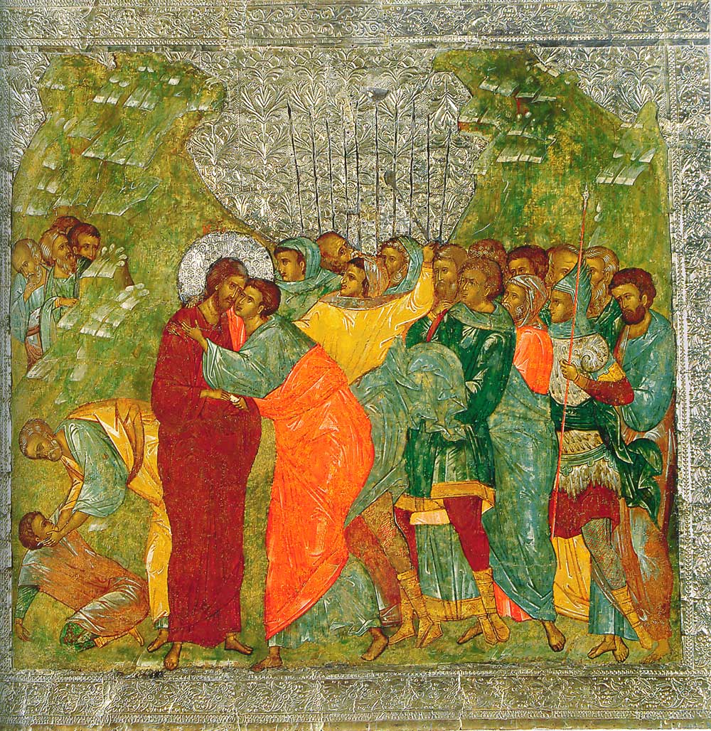 «Тогда приходит к ученикам Своим и говорит им: вы всё еще спите и почиваете? вот, приблизился час, и Сын Человеческий предается в руки грешников; встаньте, пойдем: вот, приблизился предающий Меня. И, когда еще говорил Он, вот Иуда, один из двенадцати, пришел, и с ним множество народа с мечами и кольями, от первосвященников и старейшин народных. Предающий же Его дал им знак, сказав: Кого я поцелую, Тот и есть, возьмите Его. И, тотчас подойдя к Иисусу, сказал: радуйся, Равви́! И поцеловал Его. Иисус же сказал ему: друг, для чего ты пришел? Тогда подошли и возложили руки на Иисуса, и взяли Его». (Мф. 26: 45-50)