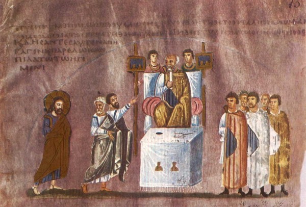 «Пилат говорит им: чтó же я сделаю Иисусу, называемому Христом? Говорят ему все: да будет распят. Правитель сказал: какое же зло сделал Он? Но они еще сильнее кричали: да будет распят. Пилат, видя, что ничто не помогает, но смятение увеличивается, взял воды и умыл руки перед народом, и сказал: невиновен я в крови Праведника Сего; смотрите вы. И, отвечая, весь народ сказал: кровь Его на нас и на детях наших. Тогда отпустил им Варавву, а Иисуса, бив, предал на распятие». (Мф. 27: 22-26)