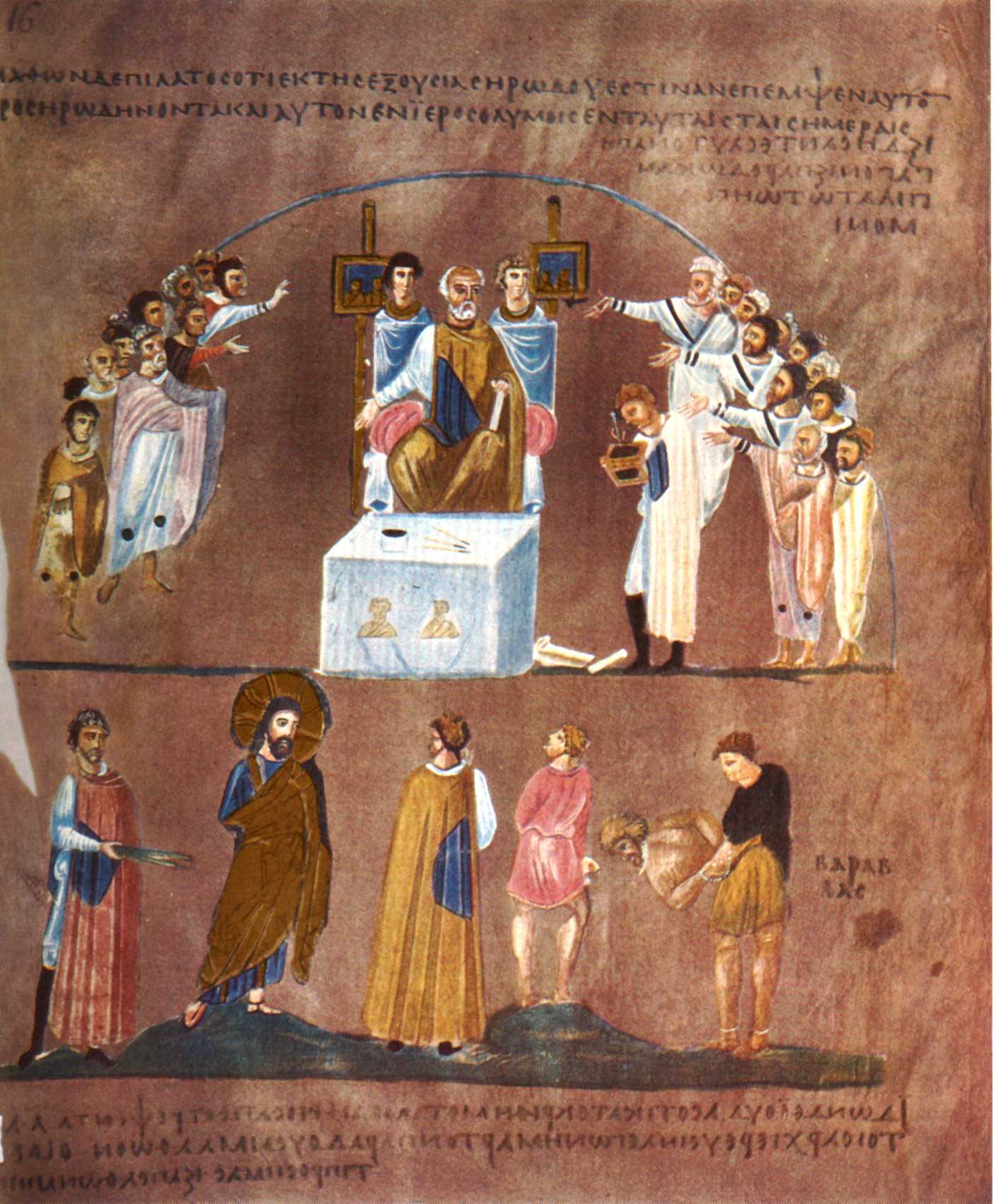 «На праздник же Пасхи правитель имел обычай отпускать народу одного узника, которого хотели. Был тогда у них известный узник, называемый Варавва. Итак, когда собрались они, сказал им Пилат: кого хотите, чтобы я отпустил вам: Варавву, или Иисуса, называемого Христом? ибо знал, что предали Его из зависти. Между тем, как сидел он на судейском месте, жена его послала ему сказать: не делай ничего Праведнику Тому, потому что я ныне во сне много пострадала за Него. Но первосвященники и старейшины возбудили народ просить Варавву, а Иисуса погубить. Тогда правитель спросил их: кого из двух хотите, чтобы я отпустил вам? Они сказали: Варавву». (Мф. 27: 15-21)