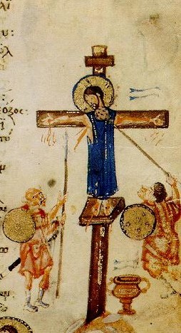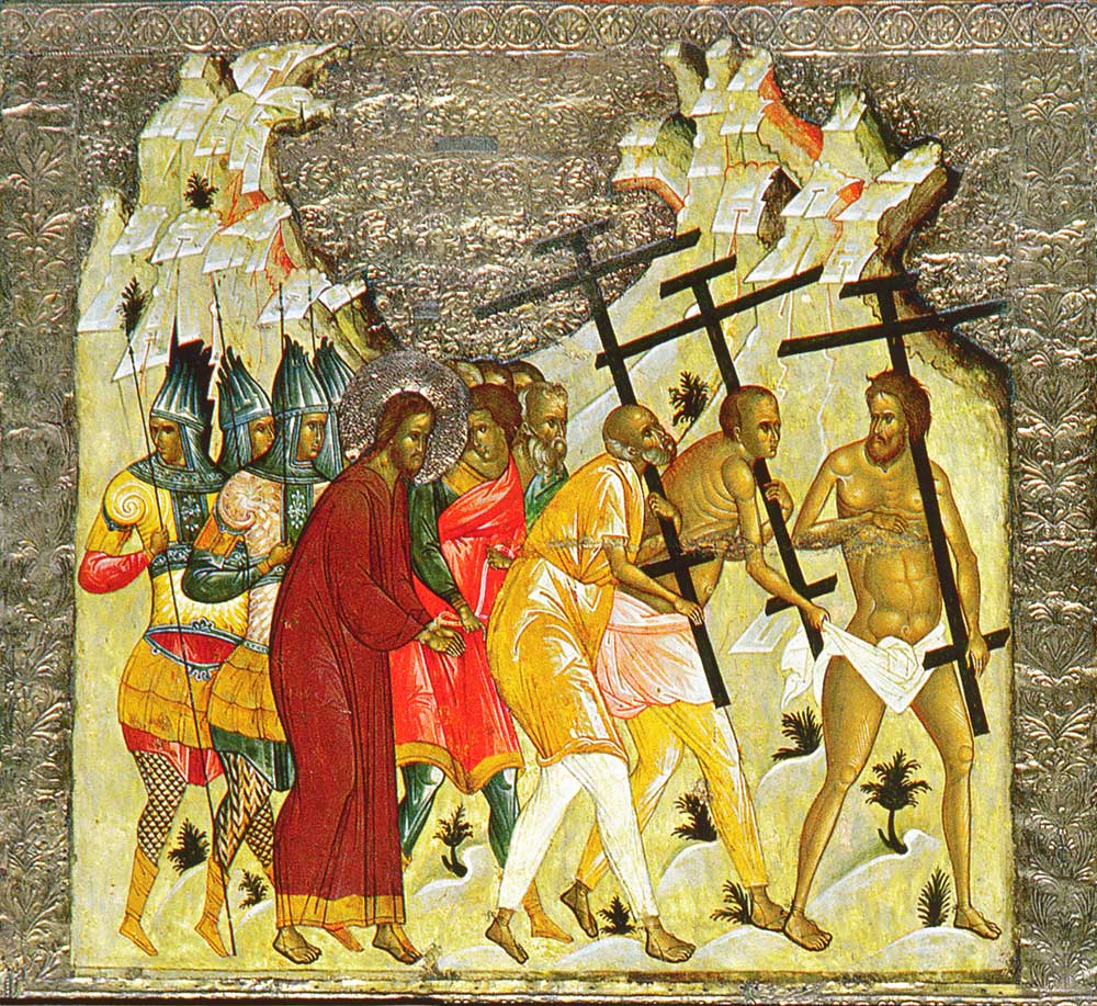 «Распявшие же Его делили одежды Его, бросая жребий; и, сидя, стерегли Его там. И поставили над головою Его надпись, означающую вину Его: Сей есть Иисус, Царь Иудейский. Тогда распяты с Ним два разбойника: один по правую сторону, а другой по левую». (Мф. 27: 35-38)