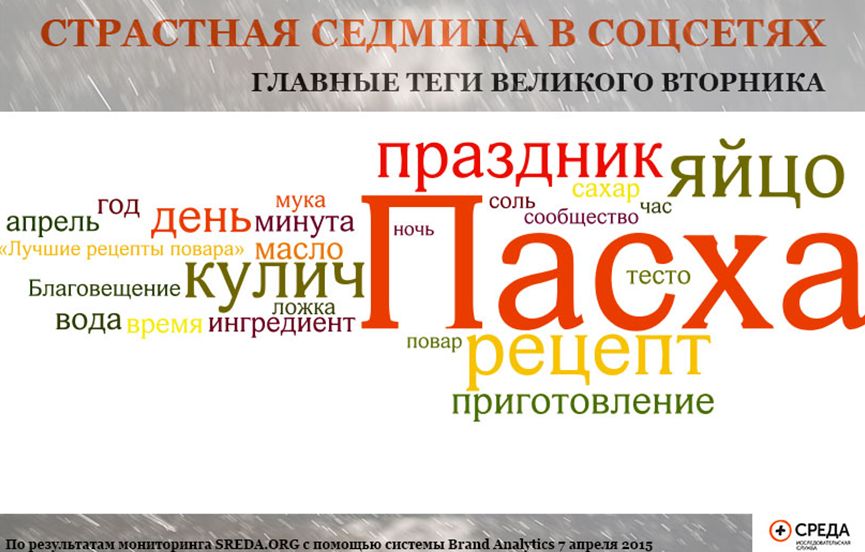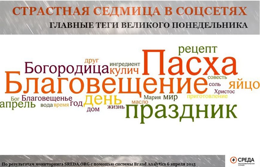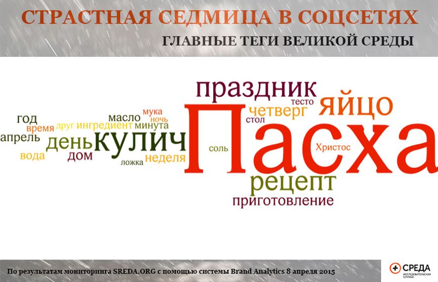 Мониторинг социальных сетей проведён Исследовательской службой «Среда» с помощью системы Brand Analytics в период с 00:00 6 апреля 2015 года по 13:00 9 апреля 2015 года. Система Brand Analytics позволяет отслеживать общедоступные публикации с упоминанием Пасхи на русском языке и не имеет доступа к записям, предназначенным только для друзей.