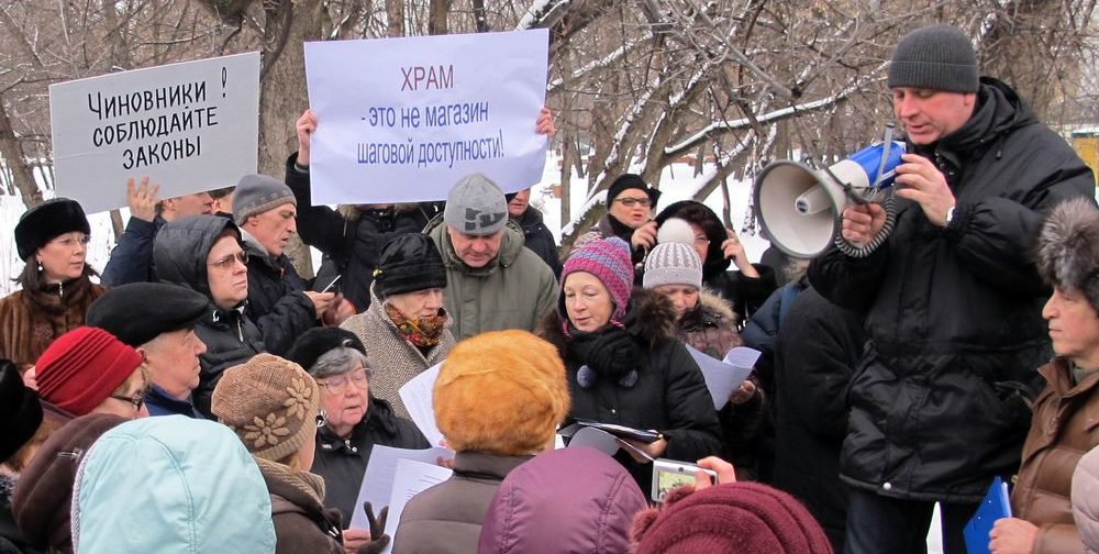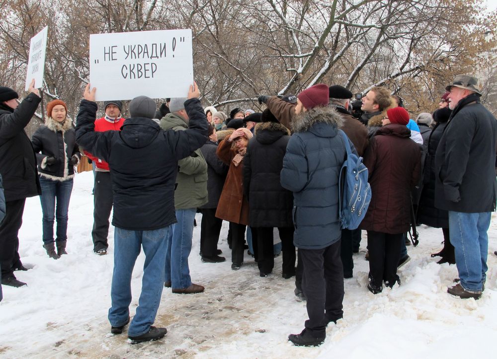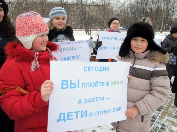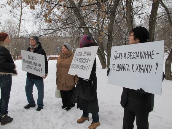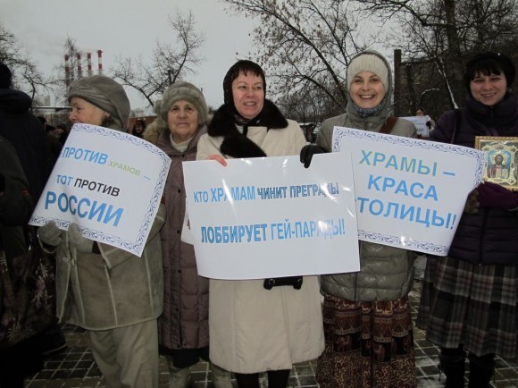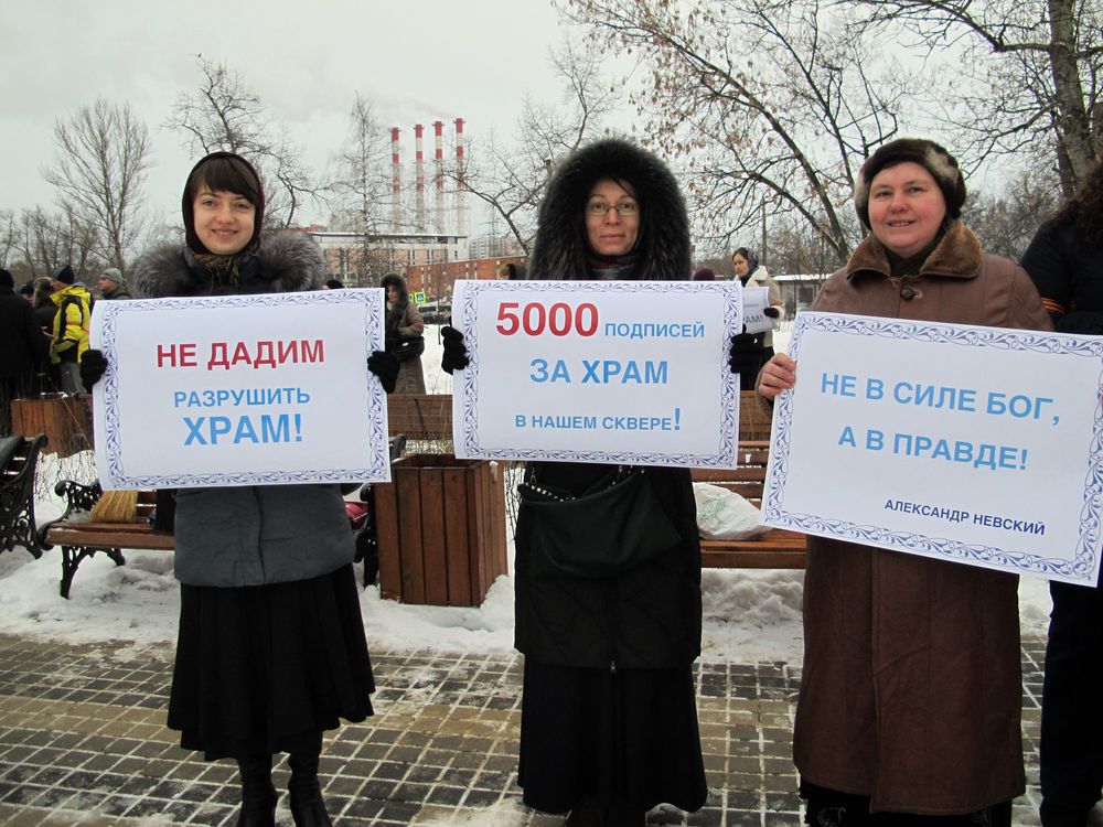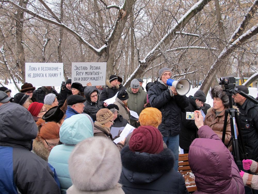У митингующих плакаты были в духе «Не укради сквер», «Заставь Ресина Богу молиться — он и сквер украдет», «Позор муниципальным депутатам». Как всегда, поминались «священники на дорогих иномарках», нехватка детских поликлиник в районе, легенды о борьбе Церкви за отмену акцизов на вино и полный набор аргументов о колокольном звоне по утрам и погребальных процессиях под окнами. Большинство митингующих традиционно добавляли, что они не против Церкви вообще, но против строительства храма именно здесь. Хотя, если человек верит, что Русская Православная Церковь — и правда оплот всякого зла и нечестной коммерции, лидер черного ювелирного рынка и коррупции с недвижимостью, то бороться логично было бы со всей Церковью, а не за перенос площадки под конкретный храм на 500 метров.