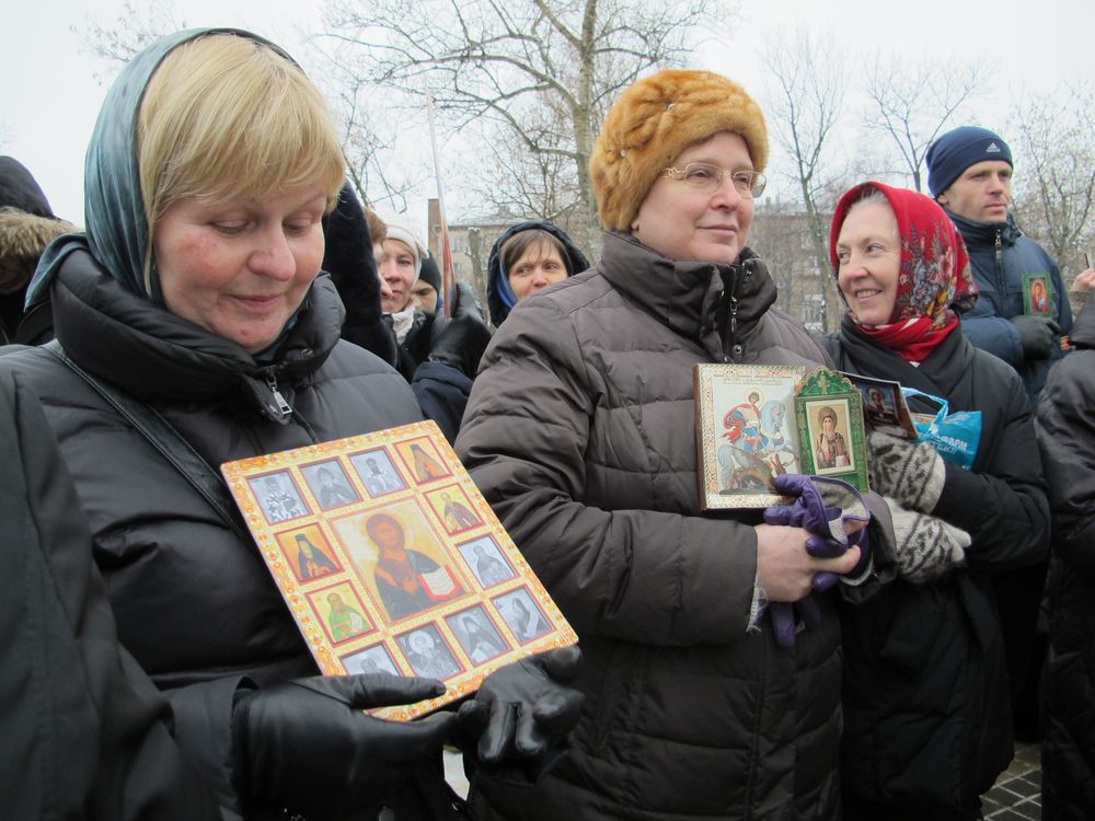 Община будущего храма собралась параллельно митингу в том же сквере. Между оппонентами было 20 метров и 4–5 сотрудников полиции. От группы к группе сновали немногочисленные журналисты, на дорожке между оппонентами встречались активисты, желающие познакомиться и выяснить отношения.