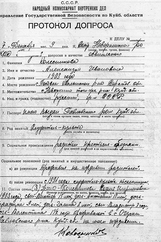 Первая страница протокола допроса священника Александра Ивановича Колесникова, произведенного 7.12.1937 г., за день до его второго ареста