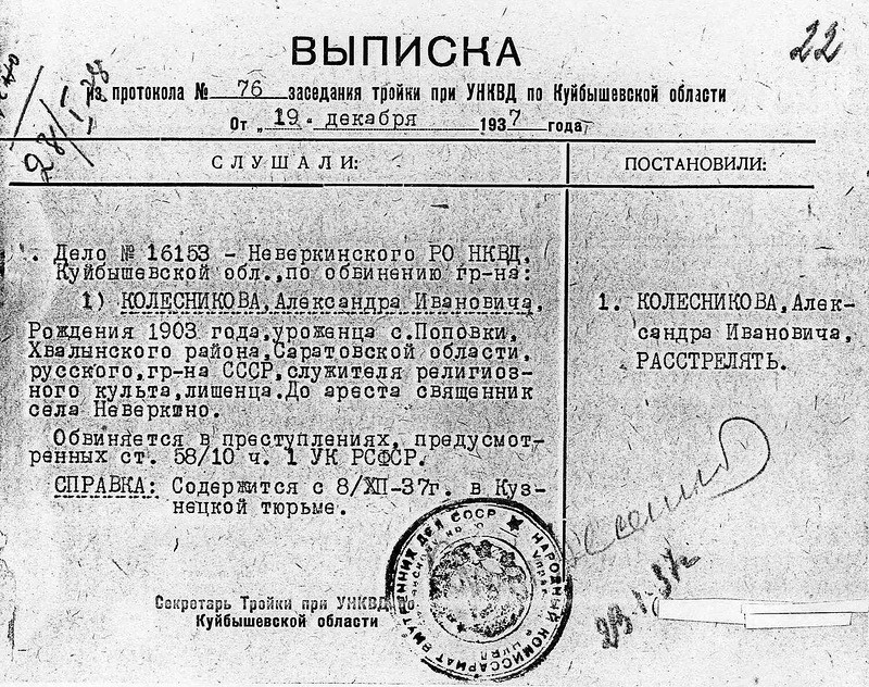Акт о приведении в исполнение приговора «Тройки в отношении Колесникова Александра Ивановича» составлен 23 января 1938 г. Иерей Александр Колесников был казнён, предположительно, в Дуванном овраге г. Кузнецка, где с 1919 г., среди других, расстреливалось православное духовенство.