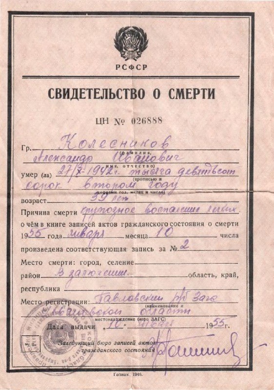 Через некоторое время, им пришел ответ в том, что Колесников Александр Иванович якобы умер в заключении в 1942 г. от крупозного воспаления лёгких и, затем, Павловским ЗАГСом была выдана соответствующая справка. Священник Александр Колесников был реабилитирован Прокуратурой Ульяновской обл. только в 1995 г.