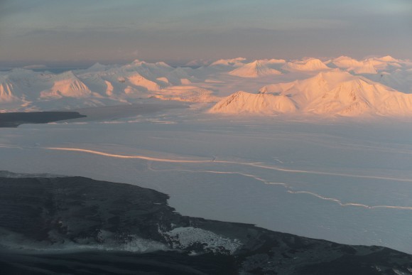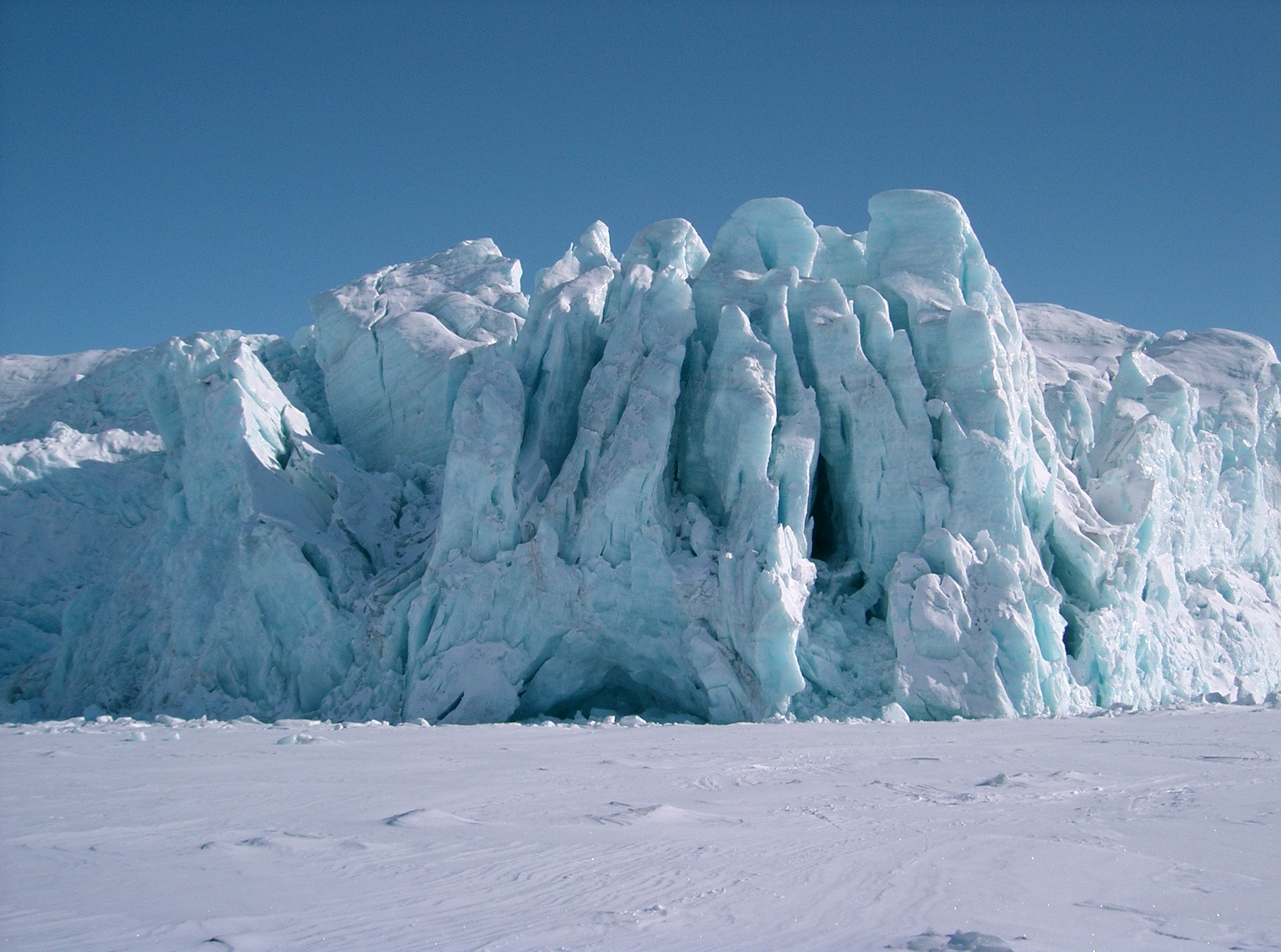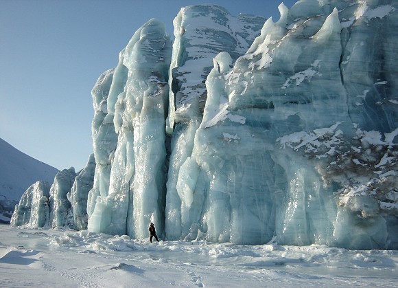 Я не успел побывать на леднике, а только сфотографировал его с вертолета напротив поселка Пирамида. Ледник — это большая масса льда — ледяная река, которая очень медленно течет и обламывается айсбергами в океан. К ледникам запрещено подходить, потому что они могут обрушиться на голову. Но русские не могут с этим смириться. Говорят, что если побывал у ледника и не полизал его, то все равно, что и не был (все же любили в детстве сосульки лизать).