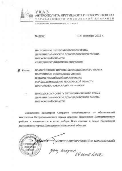 В связи с вышеизложенным считаю, что священник Димитрий Свердлов игнорирует указ Вашего Высокопреосвященства о своем назначении в штат собора Всех святых в земле Российской просиявших г. Домодедово и, таким образом, подпадает под действие правила 36 свв. Апостолов («Если кто, быв рукоположен во епископа, не приимет служения и попечения о народе ему порученного: да будет отлучен, доколе не приимет онаго. Так же и пресвитер и диакон…»), а также текста священнической присяги («Без воли своего Архипастыря не покидать место служения, куда определен, и самовольно никуда не переходить»).