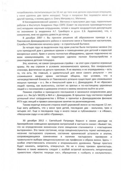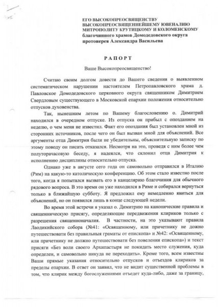 В течение 2012 года священник Димитрий Свердлов систематически нарушал церковную дисциплину в части заграничных поездок без Вашего благословения. Это побудило меня написать соответствующий рапорт (№ 95 от 10.09.2012 г., к настоящему рапорту прилагается). В итоге он был освобожден от настоятельства и назначен клириком в штат собора Всех святых в земле Российской просиявших г. Домодедово.