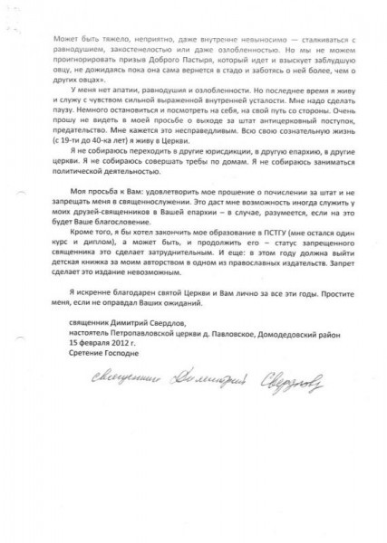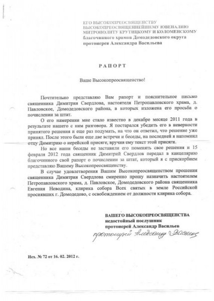 Но все наши беседы не заставили его поменять свое решения, и 15 февраля 2012 года священник Димитрий Свердлов передал в канцелярию благочинного свой рапорт о почислении за штат, который я с прискорбием представляю Вашему Высокопреосвященству.