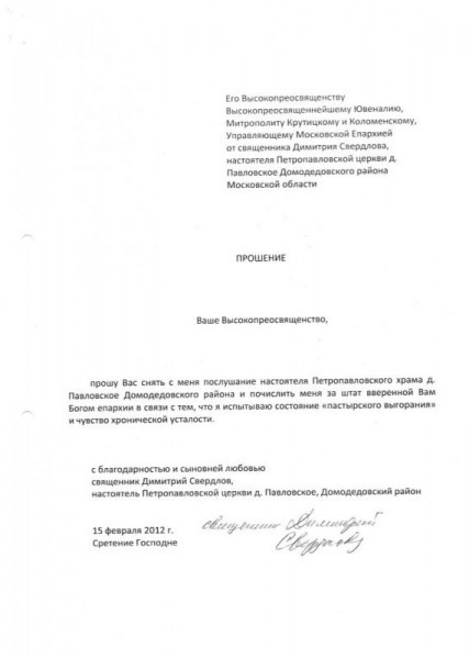 В феврале 2012 года священник Димитрий Свердлов (тогда — настоятель Петропавловского храма д. Павловское Домодедовского района, ныне -клирик собора Всех святых в земле Российской просиявших г. Домодедово) подавал на Ваше имя прошение (к рапорту прилагается), в котором выражал свое желание выйти за штат вследствие «пастырского выгорания». Это его прошение было Вами отклонено.
