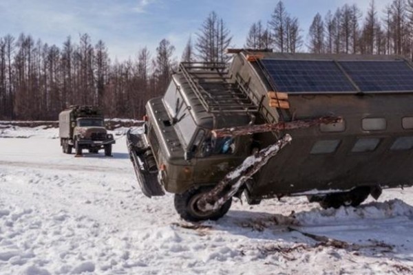 В вездеходе 4 складные койки, дровяная печь, пол с электроподогревом. На крыше установлены солнечные батареи, двигатель от БТР, баки для топлива на 250 и 500 литров, снаружи смонтирован походный душ.