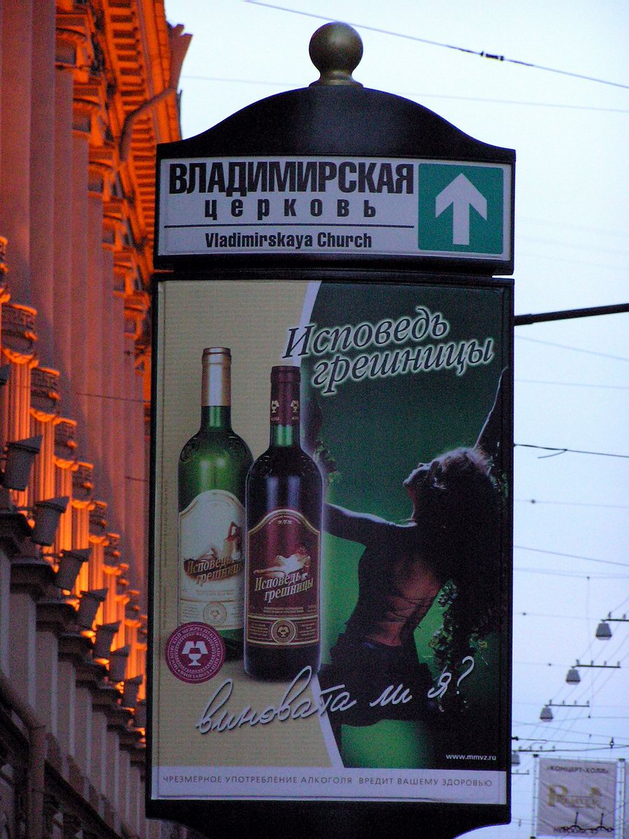 Хорошее рекламное решение. Всем грешницам — во Владимирскую церковь. На исповедь, в том числе каяться в грехе пития сомнительного вина.