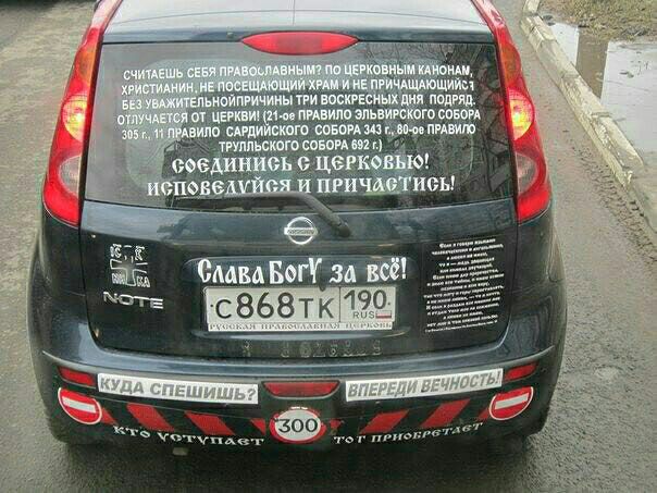 Предписания православным можно встретить не только в монастырях и храмах, но и просто на улице. Пожалуйста — автомобиль миссионера 80-го уровня.