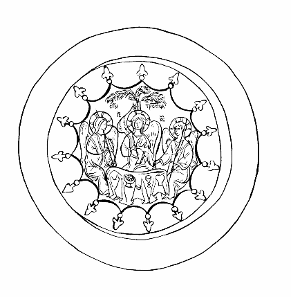Такого рода изображений “Гостеприимства” сохранилось немало и в древнерусском искусстве: можно указать хотя бы пластины врат собора Рождества в Суздале (1230–1233 гг.); пластины Васильевских и Тверских врат (XIV в.); ряд резных и гравированных панагий XV в.; икону Троицы из Ростова Великого (XV в.) в собрании Третьяковской галереи; шитый покровец (ок. сер. (?) XV в.), в собрании Сергиево-Посадского музея21. Для всех них характерно наличие крещатого нимба только у центрального ангела и отсутствие “клавов” у боковых (а иногда и у всех трех) ангелов.