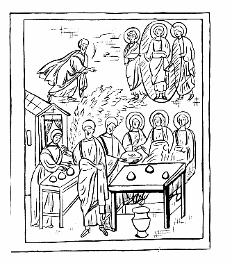 Иконография первого вида (образ Бога Сына с двумя ангелами) есть, — подчеркнем это еще раз, — изображение (причем почти “приточного”, по древнерусскому выражению, характера) только сцены “Гостеприимства”— не более. Именно так это изначально понималось и на Руси, о чем свидетельствует одно из “Слов” свт. Кирилла Туровского (XII в.), где Христос обращается к апостолу: “Веруй Ми, Фомо, и познай Мя, якоже Авраам, к нему же под сень с двема ангелом придох, и той, познав Мя, Господа Мя нарече”20.