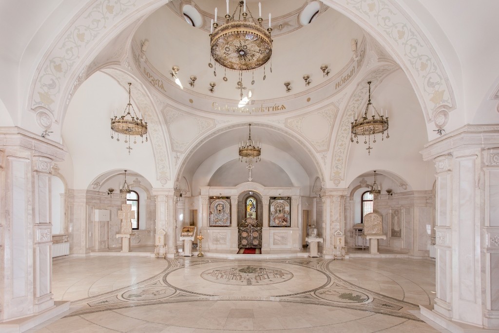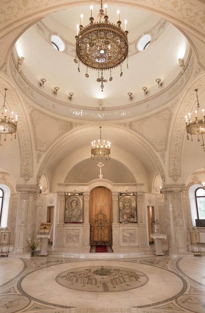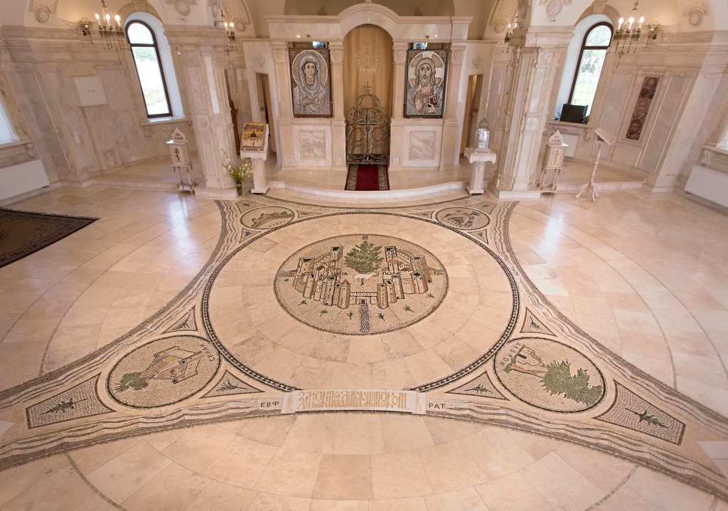 – Мозаики для храма сделал художник-мозаичист с мировым именем – Александр Корноухов. Насколько я понимаю, это вообще первый в Русской Православной Церкви за тысячу лет пример напольной мозаики – не просто декоративной, а именно сюжетной, с иконными образами, которые объединяет тема Святой Земли. В центре композиции – образ Небесного Иерусалима, с одной стороны, сделанный в традиции раннехристианской иконографии, как византийской, так и западноевропейской.