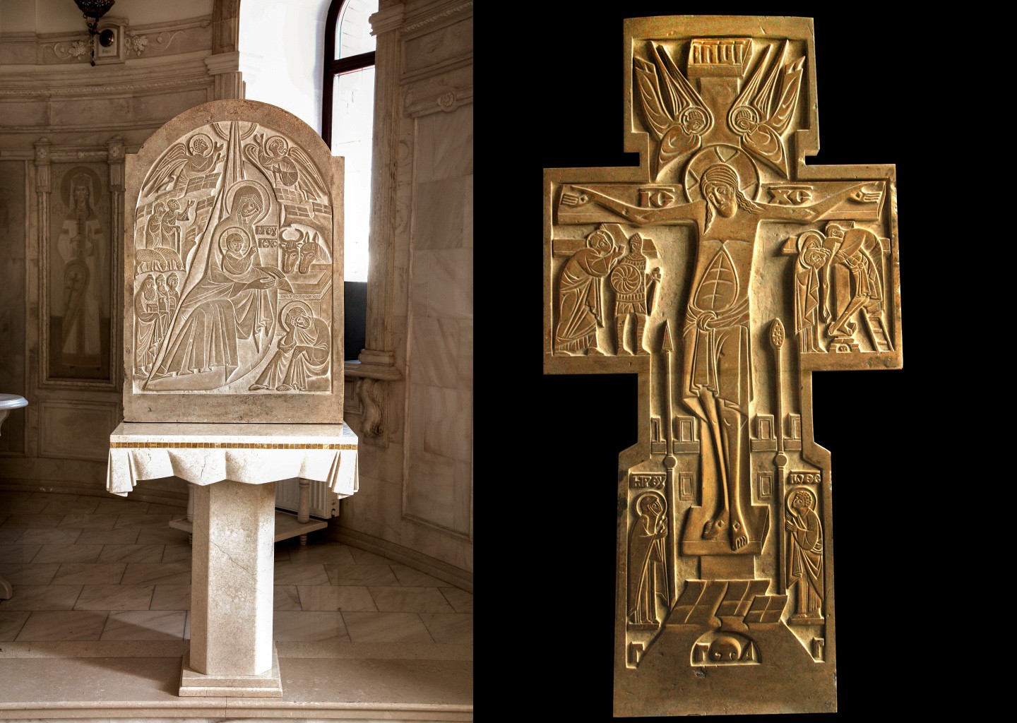 Над украшением храма работал и выдающийся скульптор Сергей Антонов. Он сделал две большие рельефные композиции, рельефные иконы из камня – «Рождество Христово» и «Распятие». Главные темы дополнены сюжетами, раскрывающими подробности происходящих ключевых событий в истории спасения. Возникает сложносочиненный образ, обладающий при этом цельной внутренней иерархической структурой. Здесь можно увидеть и византийскую, и романскую традицию резьбы по камню, но переосмысленную современным мастером, уже овладевшим достижениями пластики XX века и хорошо знакомым с разнообразными поисками модернизма.