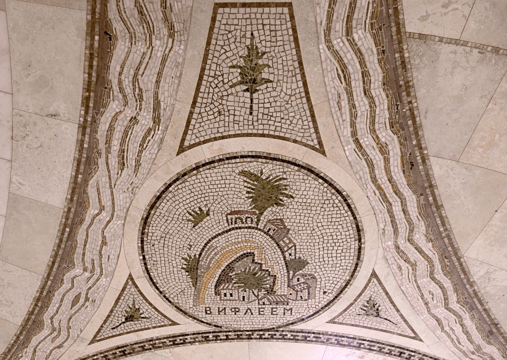 Центральную напольную композицию с Небесным Иерусалимом окружают четыре медальона с образами самых важных святых мест – это Вифлеем, Фавор, Хеврон и Синай. Композиция заключена в некую рамку из четырех райских рек. Тема райских рек, невероятно важная уже в ранней византийской традиции, ярко воплощается в Святой Софии Константинопольской, где пол расчерчен четырьмя лентами – реками. Через тему райских рек в пространстве храма – именно в напольной композиции – создавался образ Христа как источника «Воды живой».