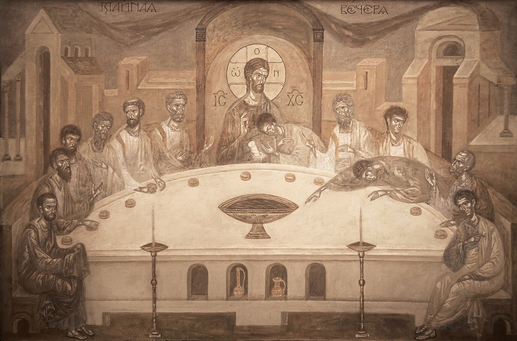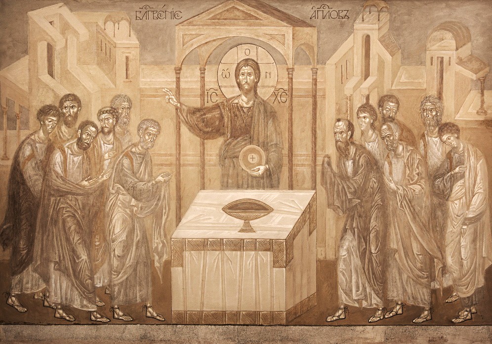 Причем был выбран редкий византийский извод не с двумя образами Христа, причащающего Телом и Кровью, а с одним образом Первосвященника в центре, который держит в руках большой дискос с Агнцем. В качестве иконографического истока можно назвать знаменитую композицию середины XI века из Софии Охридской. То есть перед нами вновь пример переосмысления традиции.