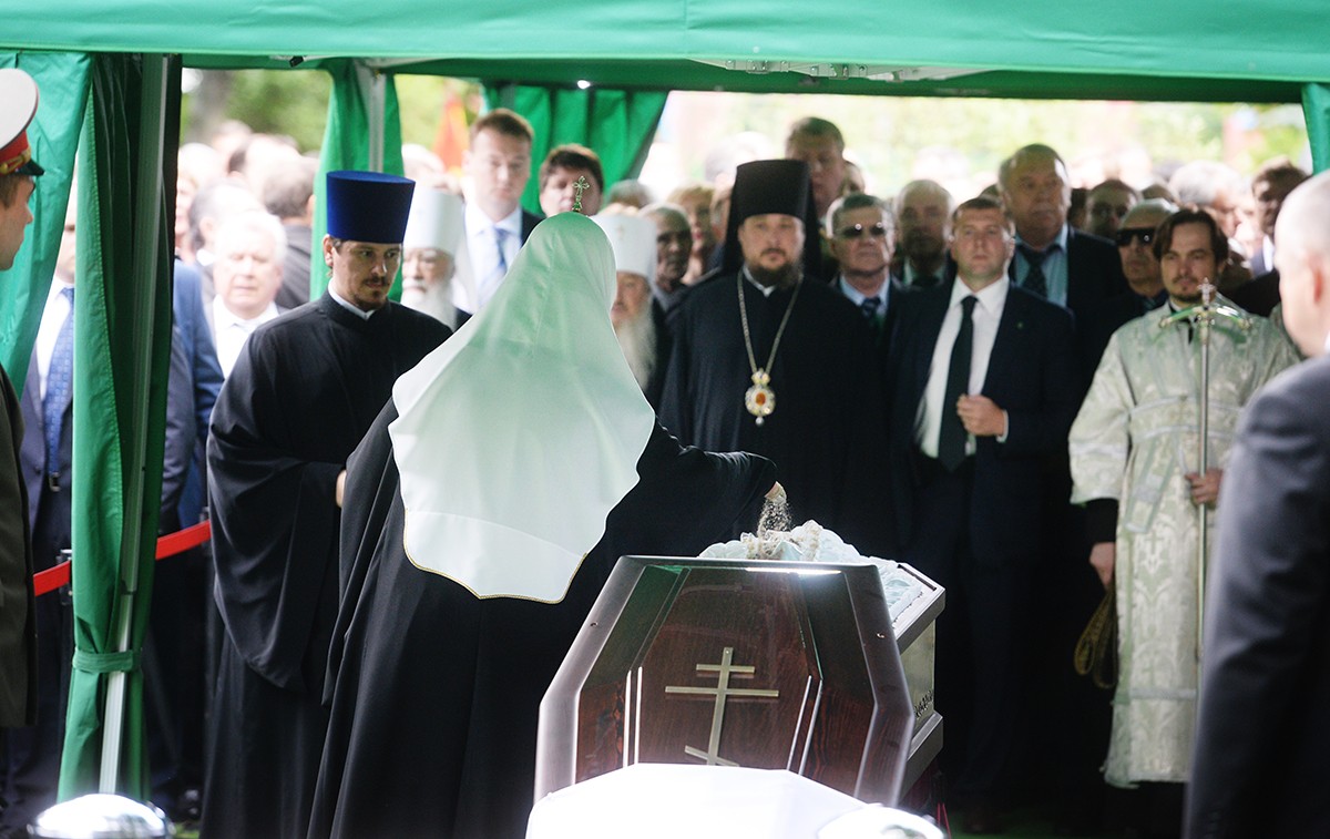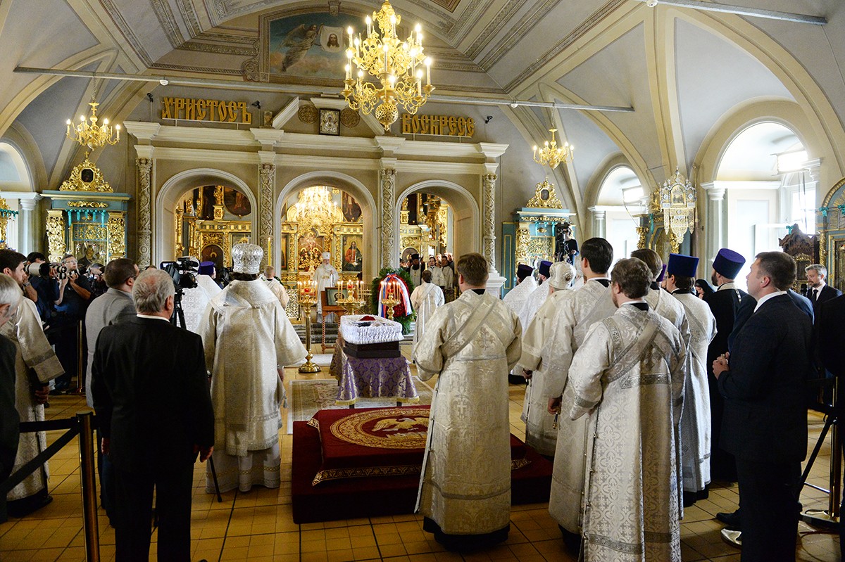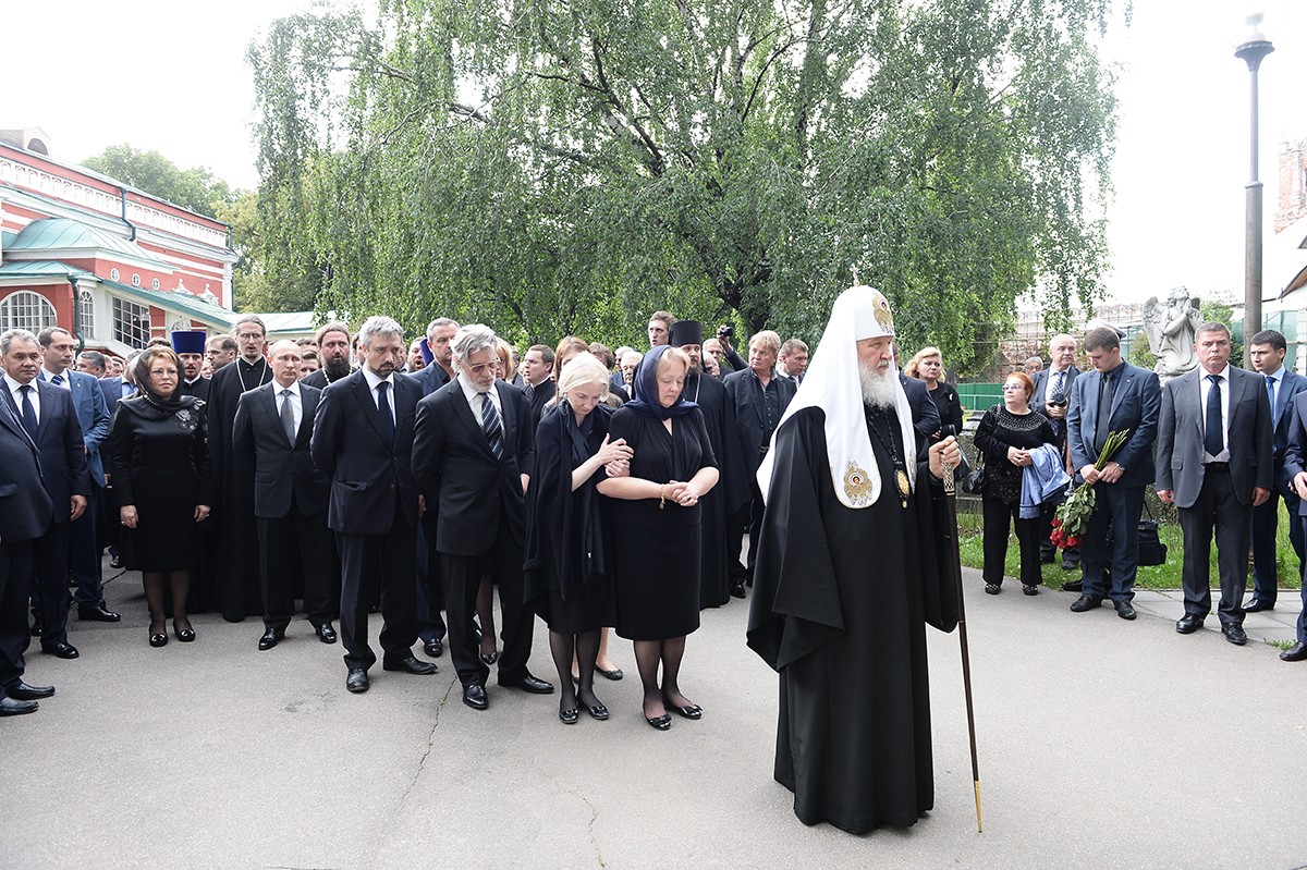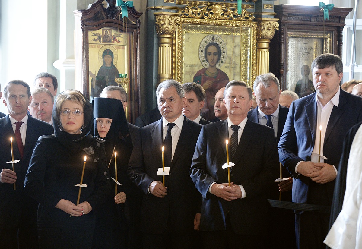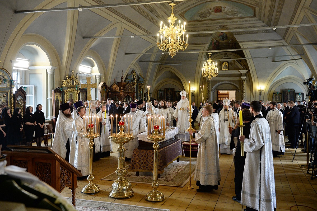 В храме присутствовали Президент Российской Федерации В.В. Путин, председатель Совета Федерации ФС РФ В.И. Матвиенко, председатель Государственной Думы ФС РФ С.Е. Нарышкин, руководитель Администрации Президента РФ С.Б. Иванов, министр иностранных дел РФ С.В. Лавров, министр обороны РФ С.К. Шойгу, представители органов власти и общественных объединений, родственники усопшего, — сообщает Пресс-служба Патриарха Московского и всея Руси