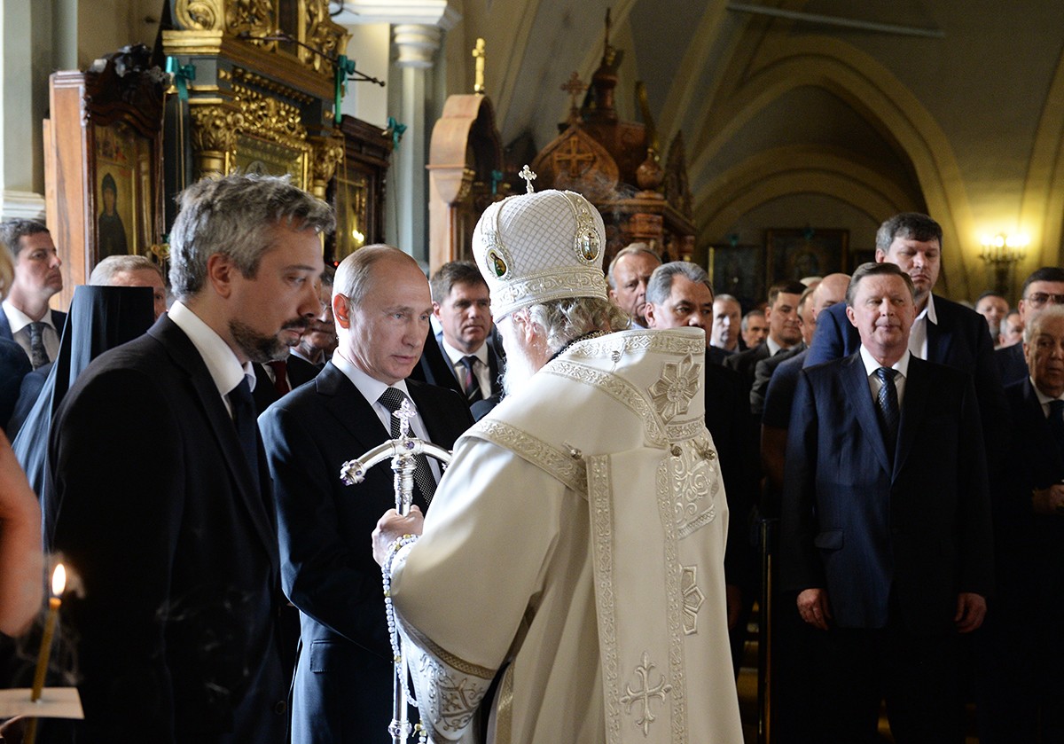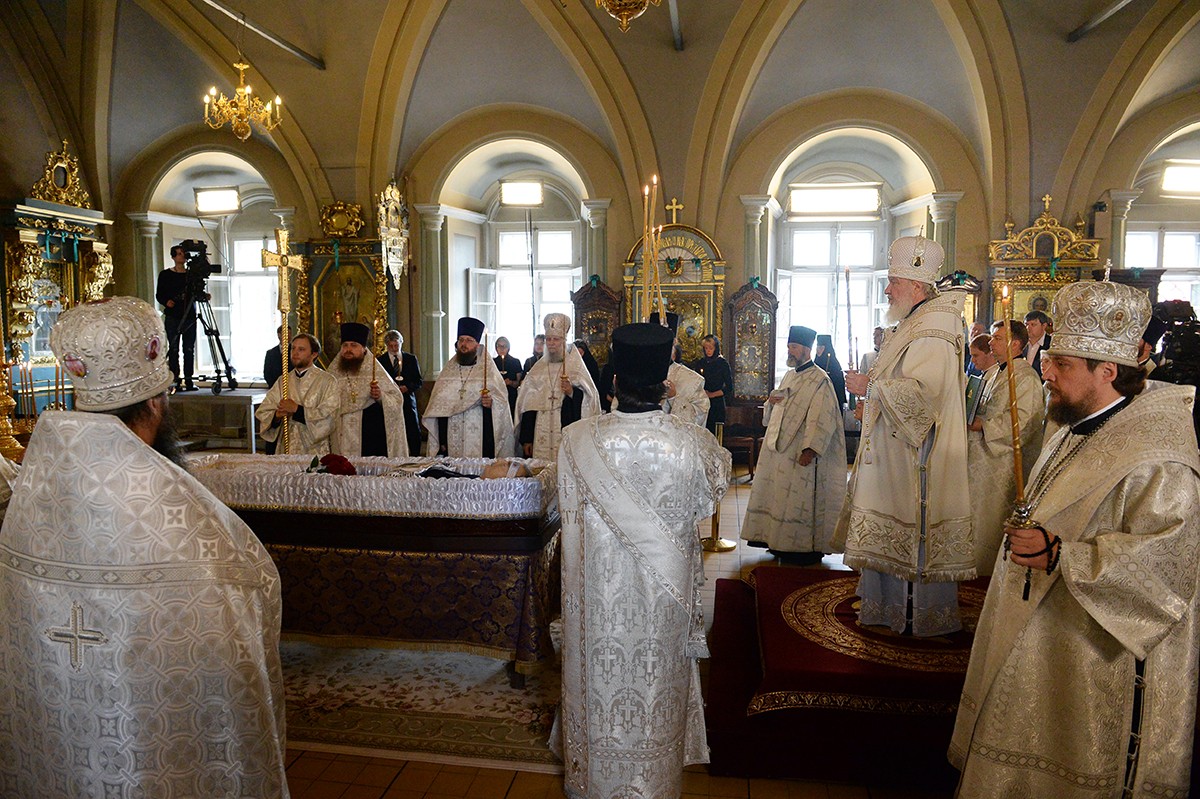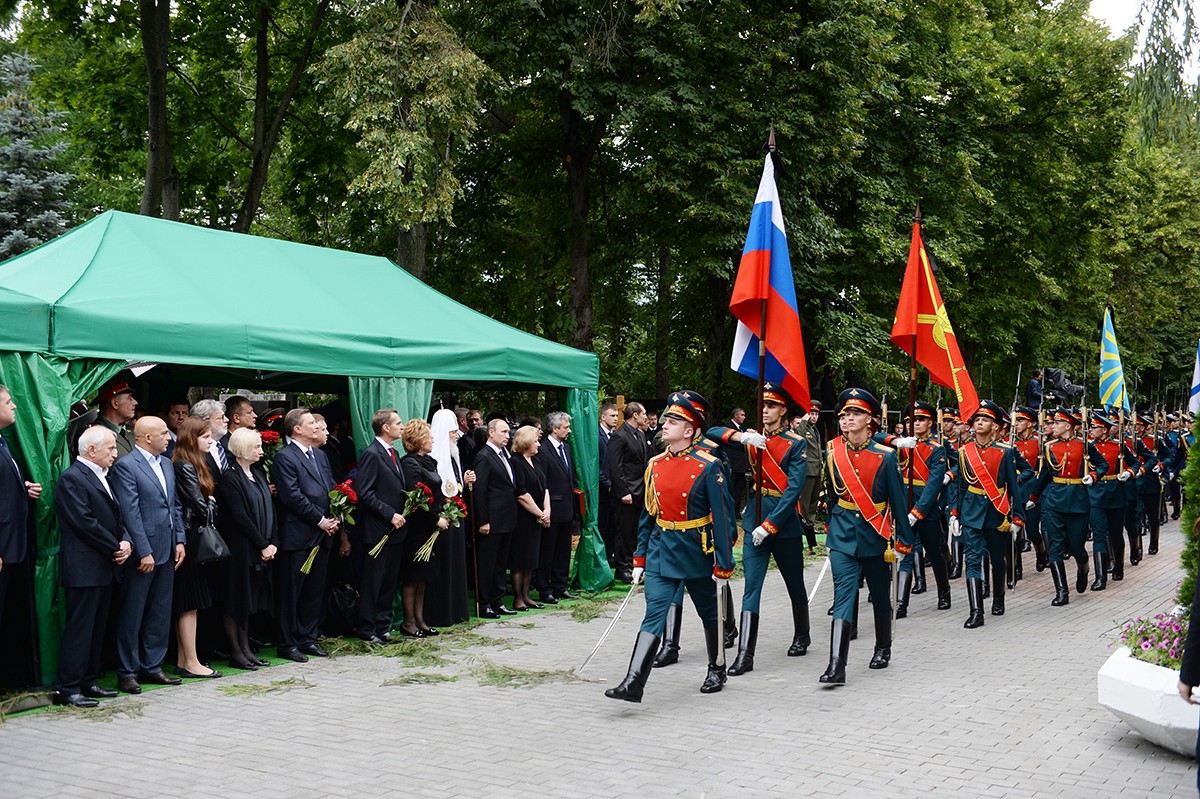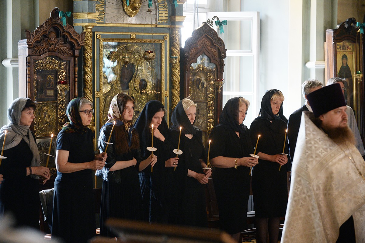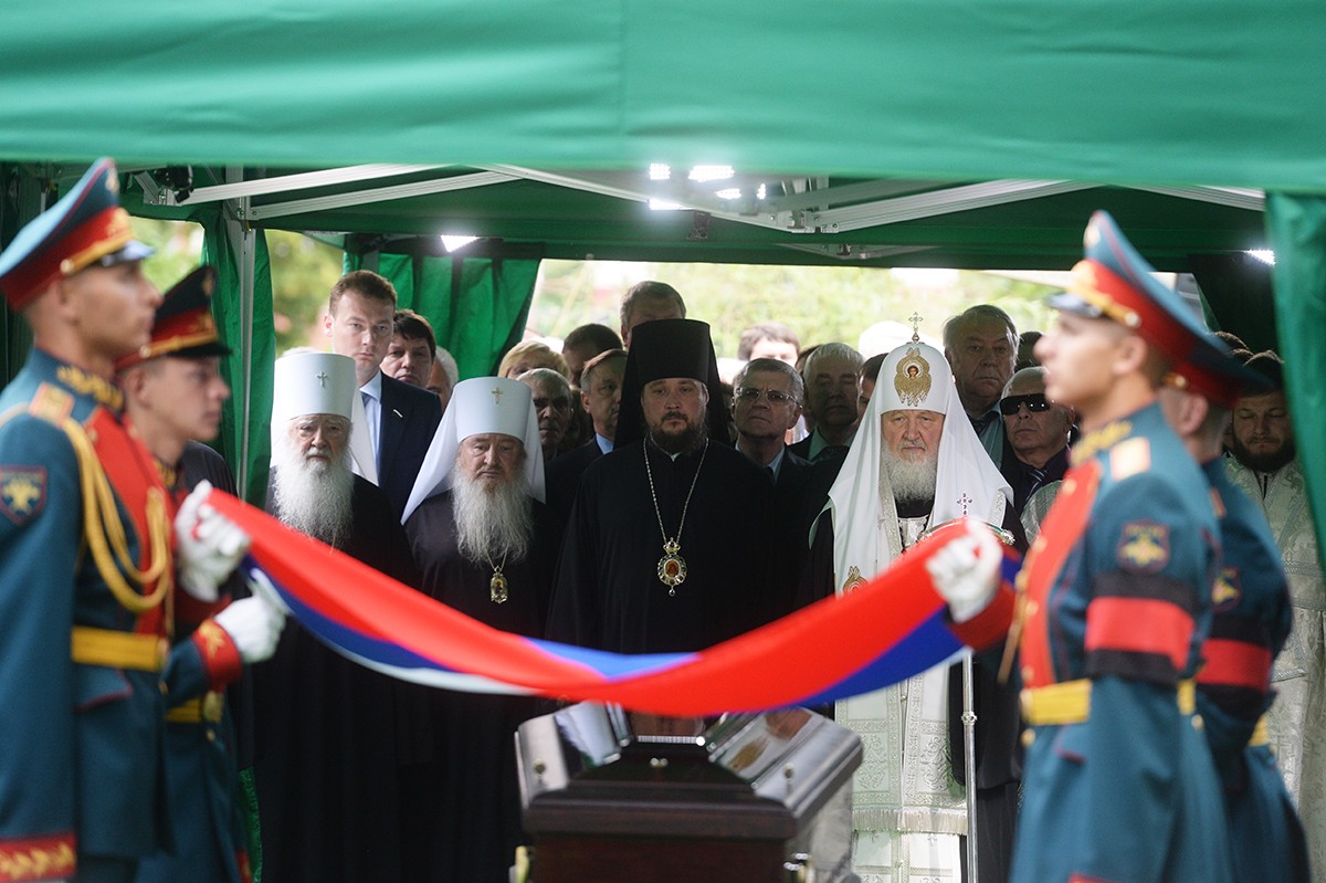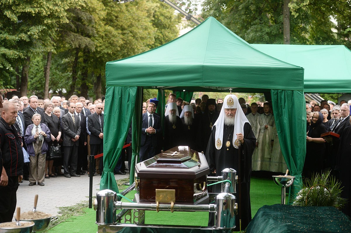 В храме присутствовали Президент Российской Федерации В.В. Путин, председатель Совета Федерации ФС РФ В.И. Матвиенко, председатель Государственной Думы ФС РФ С.Е. Нарышкин, руководитель Администрации Президента РФ С.Б. Иванов, министр иностранных дел РФ С.В. Лавров, министр обороны РФ С.К. Шойгу, представители органов власти и общественных объединений, родственники усопшего, — сообщает Пресс-служба Патриарха Московского и всея Руси