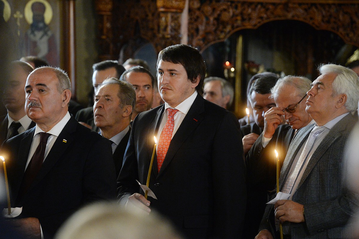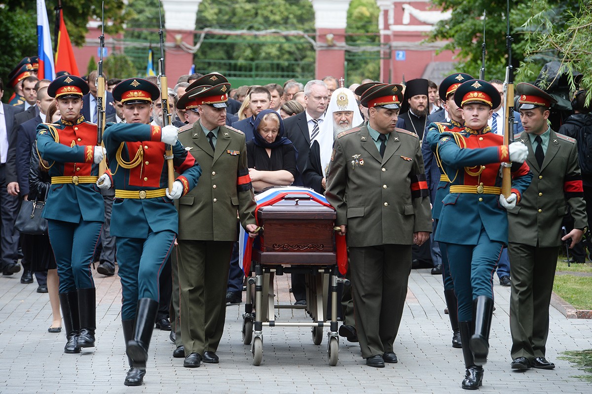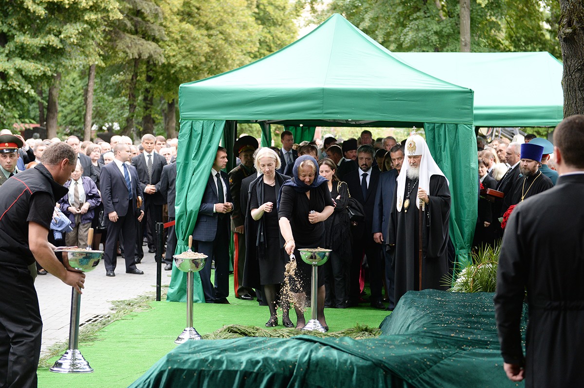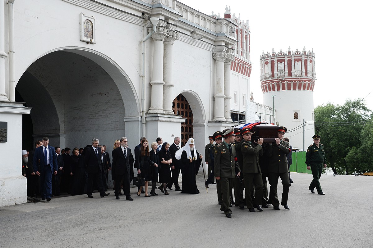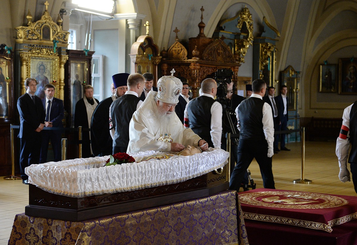В храме присутствовали Президент Российской Федерации В.В. Путин, председатель Совета Федерации ФС РФ В.И. Матвиенко, председатель Государственной Думы ФС РФ С.Е. Нарышкин, руководитель Администрации Президента РФ С.Б. Иванов, министр иностранных дел РФ С.В. Лавров, министр обороны РФ С.К. Шойгу, представители органов власти и общественных объединений, родственники усопшего, — сообщает Пресс-служба Патриарха Московского и всея Руси