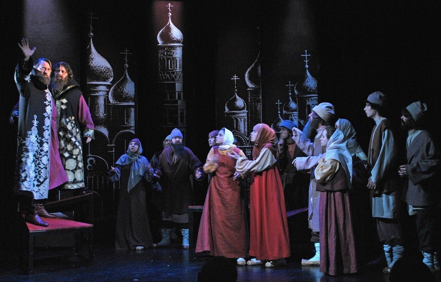 За два часа исторической драмы «Царский путь» перед зрителями проходят образы тех, кто отступил, оступился, предал, изменил… Уязвленный собственной гордыней Лжедмитрий — почти неживой механизм с застывшей гримасой на лице, передвигающийся по сцене будто на ходулях, персонаж предельно неорганичный для Руси и для православия, ясное, хрестоматийное зло, нечто даже не вполне человеческое… Вельможи, погубившие семейство Годуновых: эти, наоборот, традиционно властолюбивы, жадны, беспощадны в своих представлениях о «правильной» жизни… Сложна и противоречива фигура царя Василия Шуйского. Казалось бы, он умеет любить искреннее, но Василий мечется, предает, перечеркивая одни клятвы и давая другие, теряет опору в вере, что в конечном итоге означает падение и смерть.