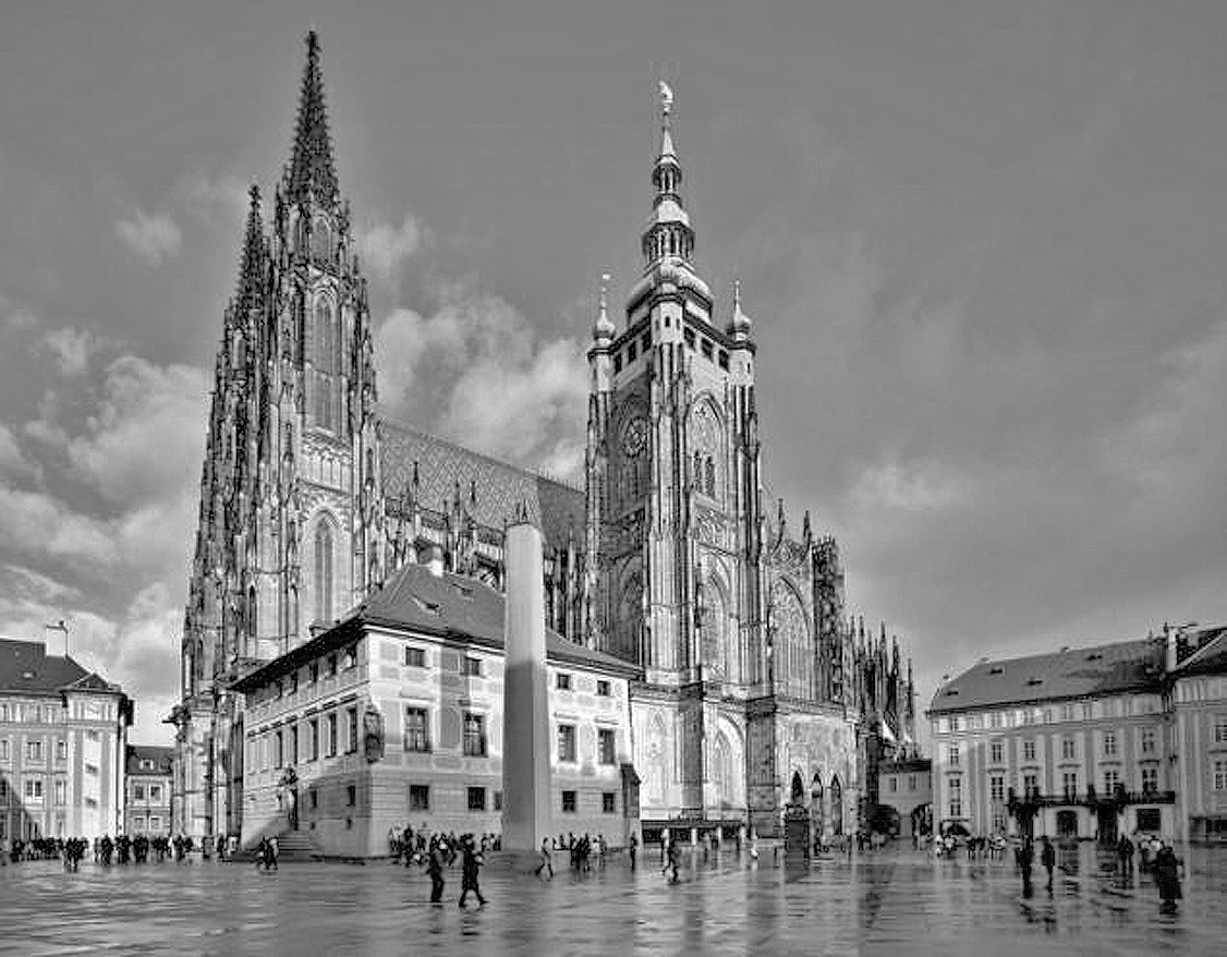 А если спуститься от Вацлавской площади ко Влтаве, то на другом её берегу можно увидеть (точнее, нельзя не увидеть) Градчаны, пражский кремль, возвышающийся над городом. А над Градчанами возвышается собор святого Вита, называемый в народе Святовит, который соорудил святой Вячеслав, и облик его незабываем. В этот собор благоверный князь в своё время перенёс мощи святого мученика Вита, а затем здесь же упокоились и его мощи. Наверное, ни один из тех, кто приезжает в Прагу, не упустит возможности поклониться гробнице святого покровителя Чехии, — ведь не только его святые мощи, но даже его шлем, меч и панцирь почитаются как святыни.