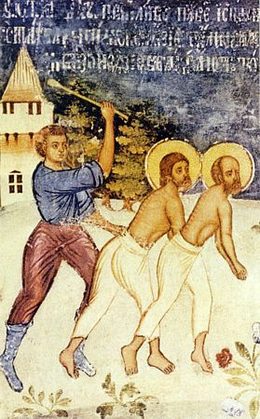 Страстотерпцы Господни,/ блаженна земля, напившаяся кровьми вашими,/ и свята селения, приимшая телеса ваша:/ в подвизе бо врага победисте/ и Христа со дерзновением проповедасте./ Того, яко Блага, молите,// спастися, молимся, душам нашим.