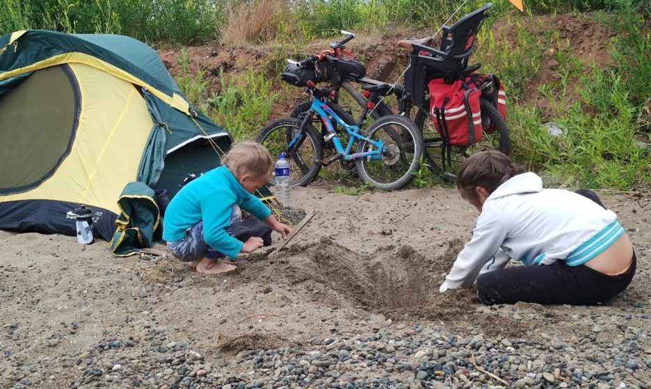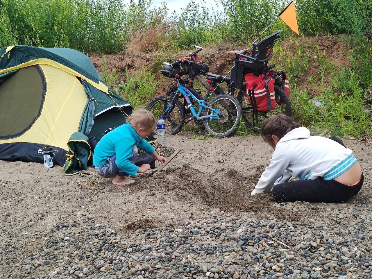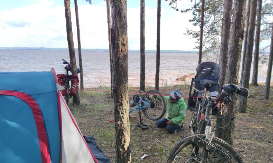 По грунтовым дорогам мы проезжали по 30 километров в день, по асфальту — 50 и более. Один из дней старший сын со мной в сцепке ехал, подкручивая педали, все 50 километров. Средний километраж в день — 30-40 километров. Закладываешь в план 35 километров, и будет тебе счастье. Чтобы не выбиться из графика.