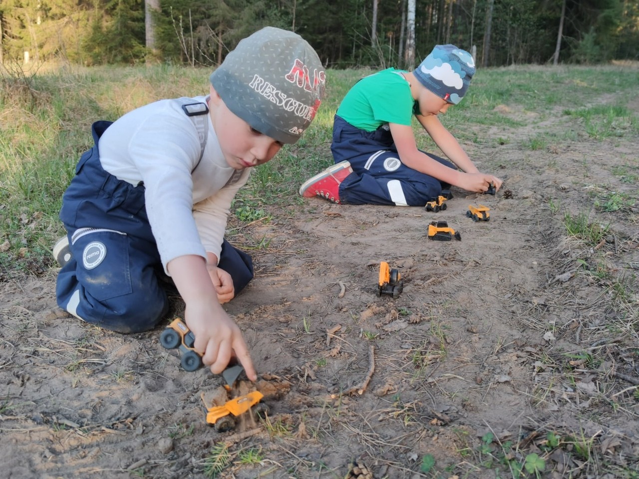 Из развлечений у наших мальчишек — повозиться со своими игрушечными самосвалами в песке. Обычно на стоянках у них лопаточки, бульдозер, другая техника — размером с детскую руку. Чтобы они могли нести (везти) все это сами.
