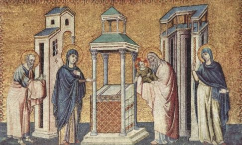 Первое дошедшее до наших дней изображение Сретения находится на арке римской базилики Санта Мария Маджоре и датируется 432–440 годами. Оригинальные особенности композиции свидетельствуют о том, что традиция изображения еще только формируется.