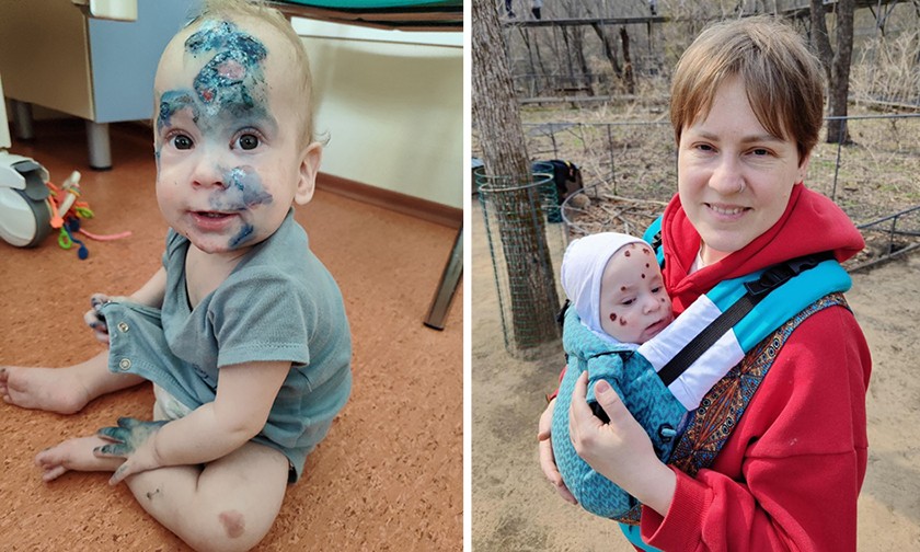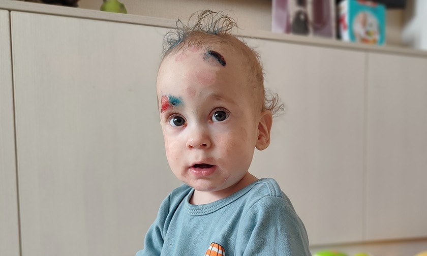 В футболке, больше похожей на длинную сорочку, годовалый Максим ползет на кухню вслед за мамой. Он открывает дверцы кухонного шкафчика и вытаскивает на пол содержимое: кастрюли, сковородки. Вертит их в руках, а потом снова кладет на полку. Когда ревизия закончена, малыш поворачивается к маме. «Ух!» — с улыбкой выдыхает он и проводит рукой по лбу, случайно задевая мокнущие язвы. Они начинают кровоточить, а он — громко плакать от боли. Анна вытирает бинтом кровь и обнимает сына: «Солнышко, мы обязательно тебя вылечим! Ты будешь самым здоровым и красивым!»