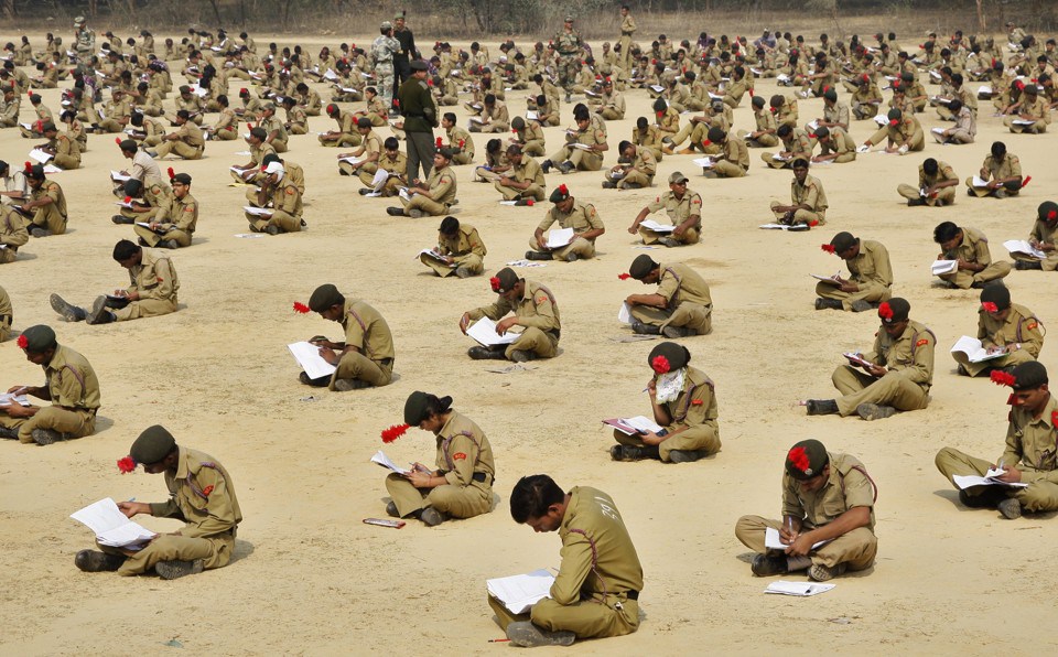 Кадеты Национального кадетского корпуса принимают участие в экзамене в северной части индийского города Аллахабада 5 февраля 2012 года.