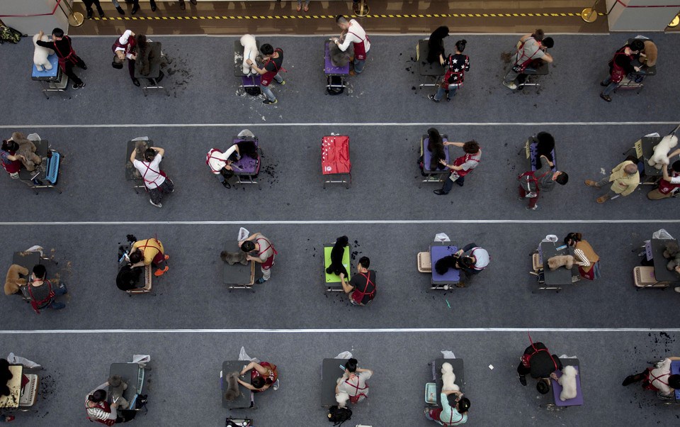 Грумеры (парикмахеры собак) посещают квалификационный тест домашнего парикмахера в Чанша, провинция Хунань, 15 апреля 2015 года.