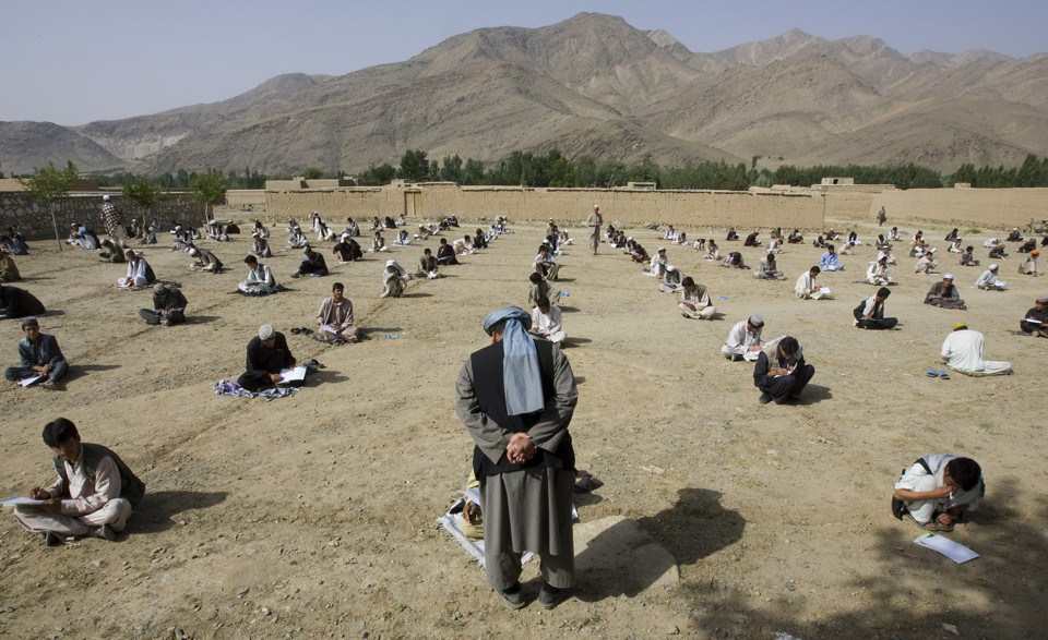 Афганский учитель стоит перед учениками во время экзаменов в школе в селе Сангаркхел в горах провинции Вардак, Афганистан 7 июля 2009 года.
