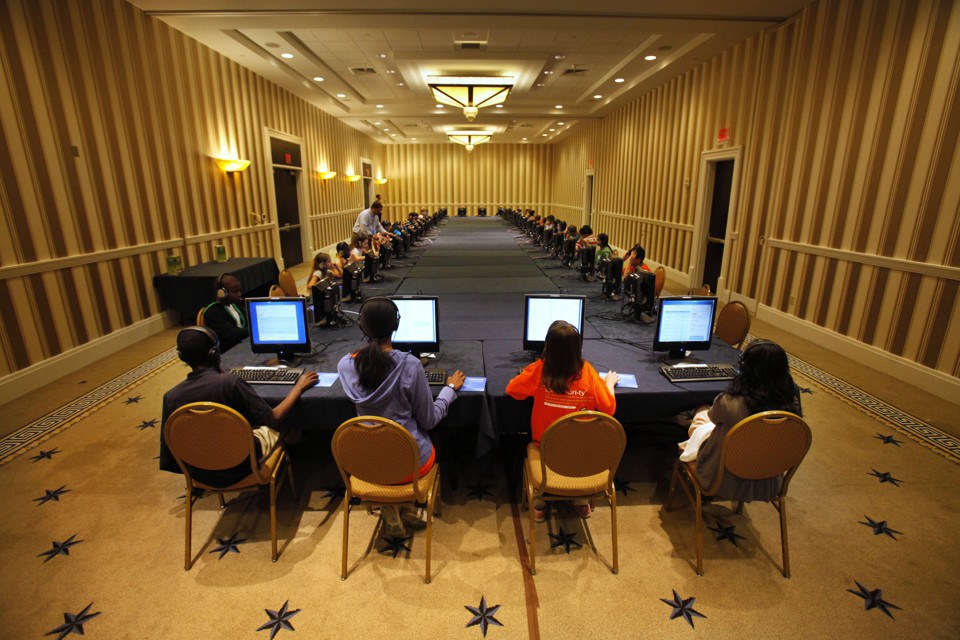 Участники Национальной Олимпиады проходят письменный экзамен на компьютерах в Оксон Хилле, штат Мэриленд, 29 мая 2012 года.