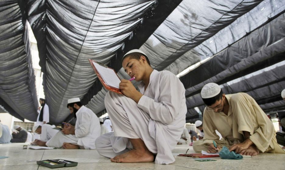 Пакистанские студенты сидят на полу во время ежегодных экзаменов в Исламской религиозной семинарии, в Карачи, Пакистан, 8 июня 2013 года.
