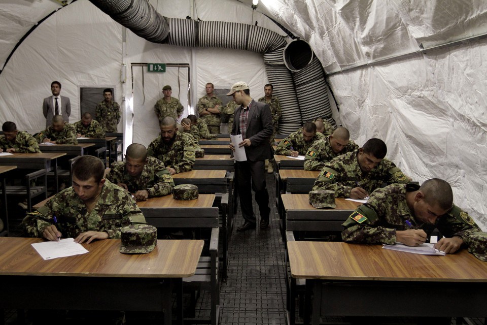 Офицеры афганской национальной армии сдают экзамены во время церемонии инаугурации в афганской армии на окраине Кабула, Афганистан, 23 октября 2013 года.