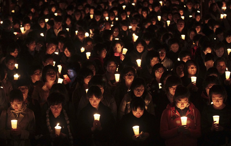 Родители со свечами молятся за успех своих детей во вступительном экзамене к колледж в буддийском храме Бонгеун в Сеуле, Южная Корея, 2 ноября 2013 года.