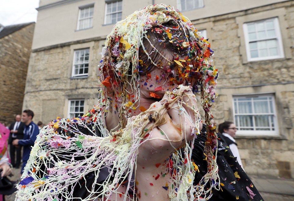 Студент из Университетского колледжа в Оксфорде после окончания экзаменов в Оксфорде, на юге Англии, 7 июня 2013 г.
