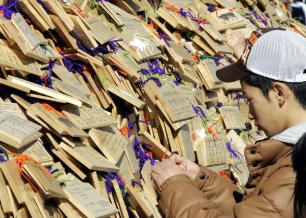 Студент привязывает свою деревянную дощечку на куче других во дворе святыни Юшима Теньин в Токио, 19 января 2008 года во время экзамена.