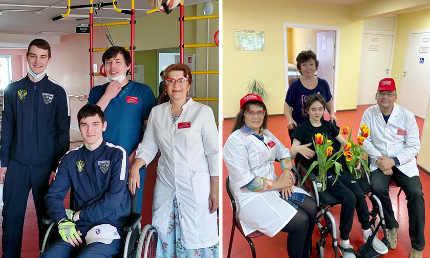 Женя Графов (слева) и Саша Ярошик (справа) с реабилитологами в Центре Ирины Волковой