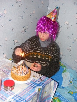 Гошу приводят в 7 утра. Он надевает крестик, принимает просфорочку и святую воду. На столе самая разная еда, но сначала Гоша угощается конфетами, освященными в церкви. Начинает трапезу с немудрёных карамелек, на которые в обычное время даже не смотрит. Отмечаю для себя нечто новое: Гоша укладывает фантики в рядочек. Обшарив все мои сумки (мне это не нравится, но с этим я справиться не в состоянии), Георгий прекращает исследовательскую деятельность и начинает играть привезёнными мной игрушками, рисует в альбоме. Рисунки просты: танк на пьедестале, вертолёт, самолёт с двумя винтами на носу, пила (почему-то она похожа на корону), восьмиконечная звезда (в церкви углядел?) , ветвь лавра, торт со свечками, а вот и нечто новенькое, ранее не встречавшееся : то ли книги, то ли уголки. Обложку альбома Гоша изрезал на «антеннки» с отогнутыми под углом усиками тонюсенькими, а сами они свёрнуты в гармошку, он их изготовляет лет с девяти-десяти.